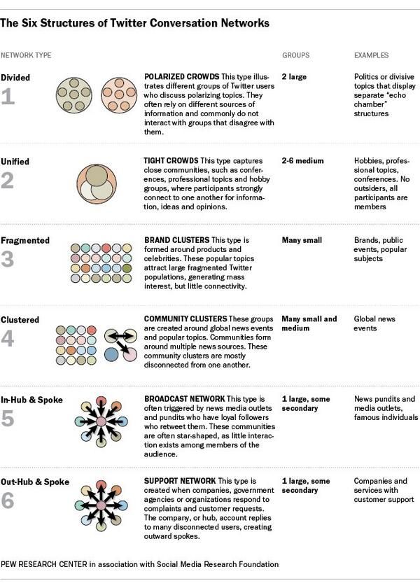Per chi è intrigato da twitter, ma lo capisce fino a un certo punto pensa che mettere le informazioni in ordine aiuti a comprendere i fenomeni. Qualche giorno fa il Pew Research Center ha pubblicato i risultati di una ricerca nel corso della quale sono state analizzate migliaia di conversazioni su twitter. Attraverso il loro studio, sono emerse 6 diverse strutture…