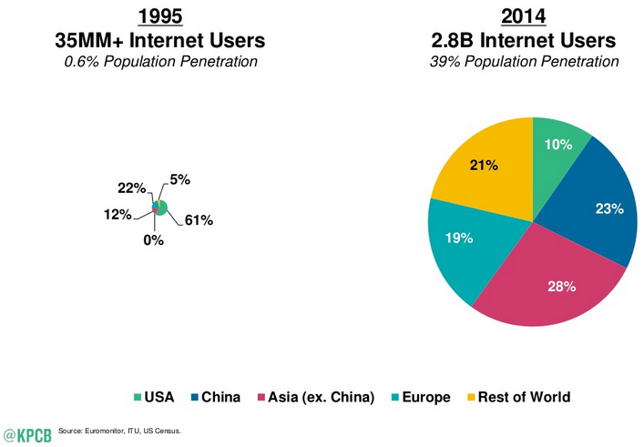 Gli utenti di internet rispecchiano grosso modo la distribuzione globale della popolazione, con ovvi picchi laddove c’è ricchezza maggiore. E allora scopriamo che a fronte di una penetrazione del 39% (nel 1995 era lo 0.6%) più del 50% degli utenti si trova in Asia. E non sono tutti in Cina.