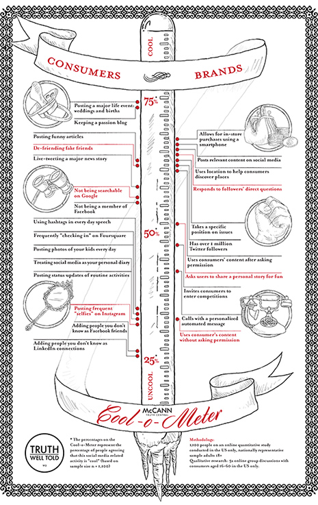 Pochi giorni fa è stato pubblicato l’aggiornamento di quello studio sintetizzato in un’infografica che misura i comportamenti in base al Cool-o-Meter, ovvero in base quanto sono apprezzabili (cool – noi toscani diremmo “ganzi”) piuttosto che considerati stupidi (uncool).