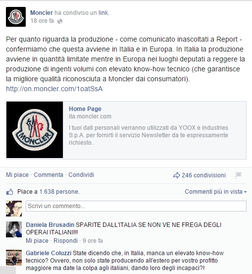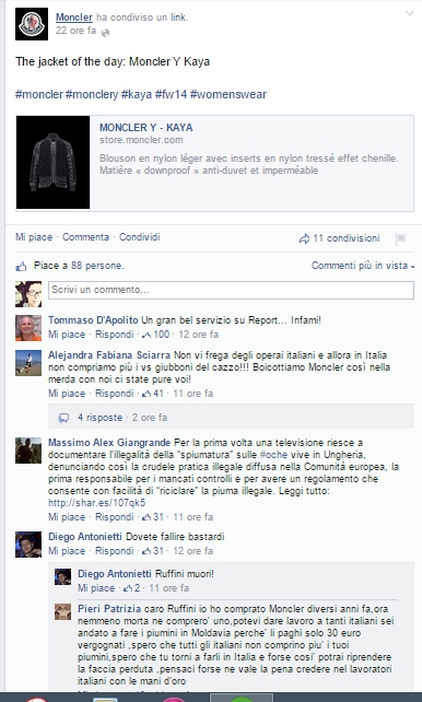 A sole poche ore dalla messa in onda del servizio, infatti, Moncler ha postato sulla propria pagina l’immagine di un bel piumino, senza minimamente accennare alla faccenda. L’odio della rete non si è certo fatto attendere.