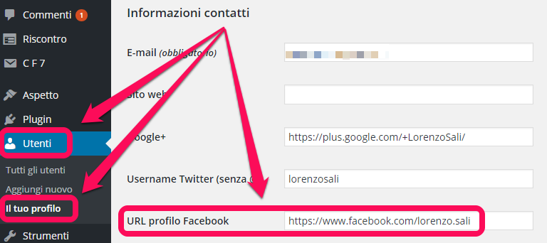 È anche opportuno che nel vostro profilo Wordrpess sia presente il link al vostro profilo Facebook. Potete impostarlo dalla pagina Il tuo profilo nell’interfaccia di amministrazione di WordPress.