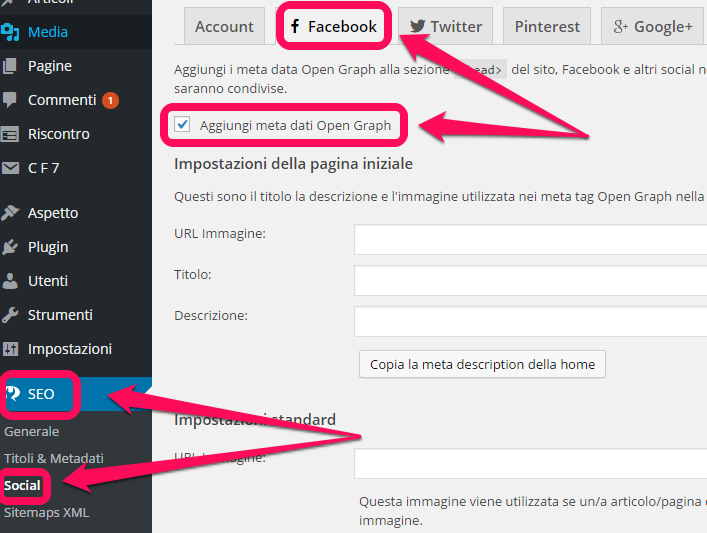 Il modo più semplice consiste nell’utilizzo di Yoast, che ha già integrato il supporto ai Facebook open graph meta data. Per verificare che il supporto sia attivato è necessario andare nelle impostazioni Social di Yoast e nella scheda Facebook spuntare (se non è già spuntato) Aggiungi meta dati Open Graph.