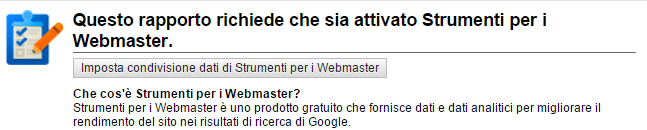 [N.B. La prima volta che cliccate su query vi viene richiesto di attivare la condivisione con Google Webmaster Tools (cioè gli strumenti per i webmaster di Google)