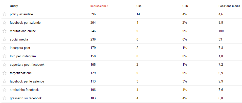 - Impressioni rappresenta il numero di volte che un link al nostro sito è stato visualizzato (sempre in relazione a quella parola chiave)