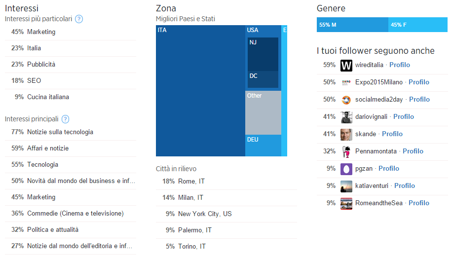 Sapere quali sono gli interessi principali e particolari dei vostri follower, nonché dove sono localizzati può essere particolarmente utile se avete intenzione di promuovere iniziative che coinvolgono la vostra presenza su twitter.