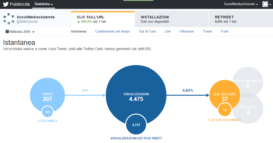 In questa sezione avete un quadro della capacità delle vostre twitter card di generare tweet.