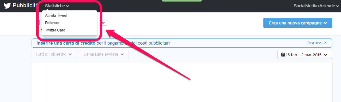 Il link è quello della pubblicità di twitter (o in alternativa ci potete arrivare dal sito di twitter analytics – il menù è leggermente diverso e c’è una sezione strumenti che tratteremo a parte, ma le pagine delle statistiche sono le stesse).