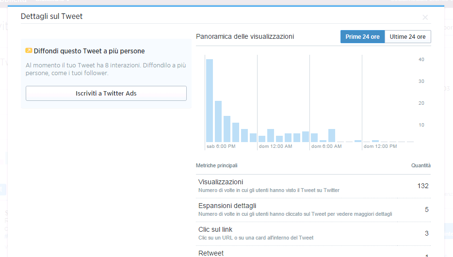 - le statistiche dettagliate di ogni tweet (per vederle basta cliccare sul tweet dall’elenco dei tweet)