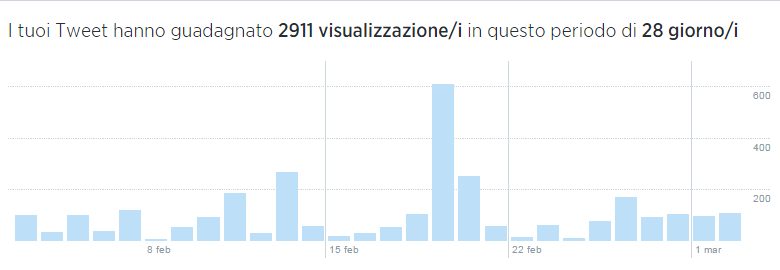Se avete aperto un account twitter, si suppone che twittiate e che (anche se non così spesso come vorreste) a seguito dei vostri tweet si verifichino degli eventi, ovvero i vostri tweet vengano visti e a volte cliccati, preferiti o retwittati.