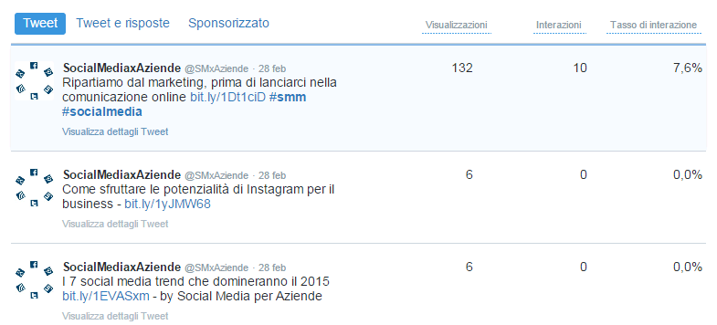 - visualizzazioni e interazioni su ogni vostro tweet (sponsorizzato o meno)
