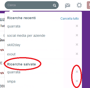 Per richiamare le ricerche salvate è sufficiente posizionarsi nel box di ricerca e comparirà la lista in bella vista sotto le ricerche recenti. Se volete eliminarne una dovete premere la x che compare a destra della ricerca.