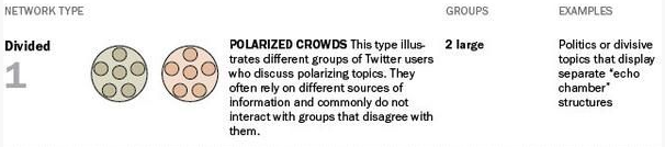 Nella prima tipologia di rete si formano due o più gruppi di persone all’interno dei quali sono presenti molte connessioni, mentre le connessioni tra i due gruppi sono molto limitate. Questa situazione è tipica delle aggregazioni politiche, in cui ciascun schieramento ha un’idea e la sostiene, ma non c’è una vera e propria discussione sul merito degli argomenti. Ciascun gruppo usa i propri hashtag e ha le proprie fonti di informazione, differenti dagli altri. Dal punto di vista aziendale probabilmente è il tipo di comunicazione meno interessante, a meno di non essere un’azienda politicamente schierata.