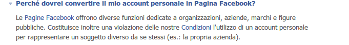 Passo per passo, in italiano (quasi!). Praticamente perderai tutto (post, foto, commenti, video…) salvo i tuoi amici che diventeranno fan. Quindi valuta bene chi sono i tuoi amici. Si tratta della zia, il fratello, l’ex e l’amico d’infanzia, oppure sono fan reali della tua azienda/prodotto/brand?
