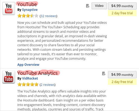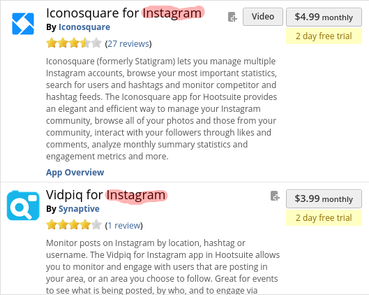 Le app oggi disponibli includono strumenti per gestire: Instagram, Tumblr, Youtube, Flickr, Mailchimp, WordPress, Trendspottr, Evernote, Blogger, StumbleUpon, Vimeo, Reddit, Storify, Foursquare, Viadeo, Sina Weibo ed altri. In più ci sono un infinità di app di analisi. La cosa che trovo davvero strana è che Pinterest non è presente in nessuna forma; né per la gestione né per l’analisi. Mah!