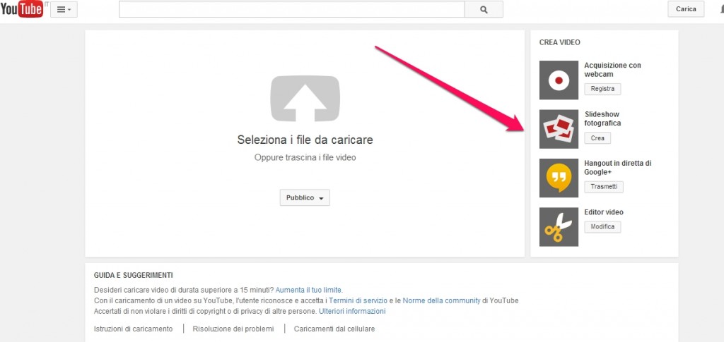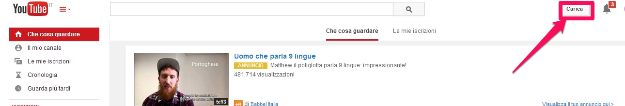 La prima cosa da fare è, ovviamente, accedere al tuo canale youtube (associato a gmail o a g+) e cliccare il tasto Carica