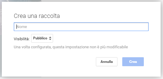 Io sono tra quelli che sostengono che gli strumenti di Google sono belli e utili, ma ci vuole un dottorato per essere in grado di utilizzarli. Ma in questo caso posso dire che creare e gestire una raccolta è immediato – è sufficiente scegliere un nome e decidere la visibilità che le vogliamo dare.