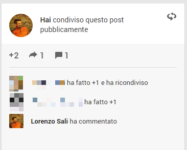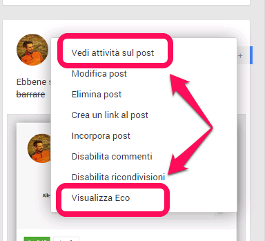 Affinché su un post sia presente l’eco, è necessario che sia stato propagato almeno una volta tramite una condivisione. Sui post di google+ su cui è presente una qualche attività compaiono due opzioni che sugli altri post sono assenti.