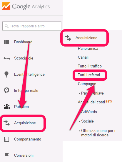 Tra le sezioni che vengono messe a disposizione da Google Analytic ce n’è anche una interessante per l’attività di web listening. Nella sezione Acquisizione tra le altre voci è presente anche Tutti i referral.