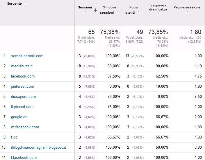Nel periodo preso in considerazione, ci sono diversi referral. La maggior parte riguardano i social: facebook, pinterest, google, t.co (che sta per twitter). Ma ci sono anche due link particolarmente interessanti: quelli relativi a dissapore.com e a ilblogdimarcomagnani.blogspot.it.