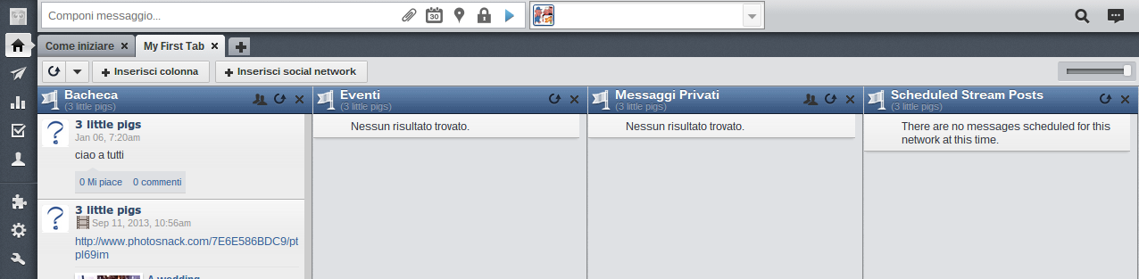 Sotto My First Tab puoi provare ad inserire qualche flusso. È probabile che all’inizio troverai i flussi aggiunti automaticamente da Hootsuite. Se ci sono non ti resta che controllarli. Se non ci sono vediamo come crearli.