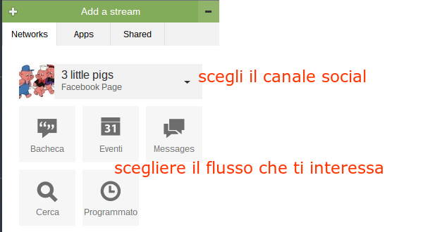 Per ogni mezzo social, Hootsuite ti offre tutti flussi che puoi avere per quel social. Basta scegliere.