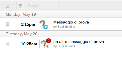 ma noi per ora ci accontentiamo di vedere la lista dei post che abbiamo in uscita. Basta passare sopra la voce della lista con il mouse per vedere il contenuto del post per esteso, ma per controllare bene se ci sono allegati o link bisogna aprire il post (cosa che puoi fare direttamente dalla lista).