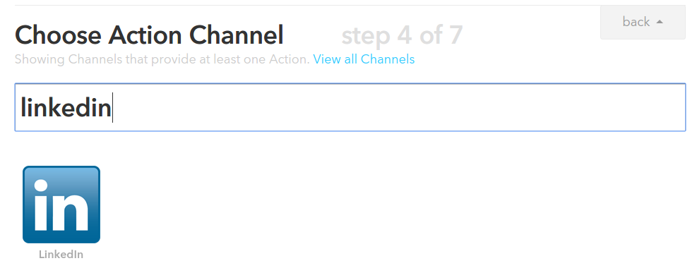 A questo punto IFTTT ti chiede di connettere il tuo profilo di LinkedIn e di dare i permessi alla piattaforma per pubblicare dal tuo account. Fatto ciò IFTTT vuole sapere come vuoi pubblicare il tuo post, se con semplice link (share an update) oppure con un commento (share a link). Ovviamente se scegli di pubblicare anche un commento a) sarà lo stesso commento ogni volta e b) dovrà essere sufficientemente banale da essere pertinente per ogni post che pubblichi, tipo “Ecco un nuovo post”. Direi che posso fare a meno del commento. Scelgo share an update. (Se sbagli, occhio a non usare il tasto pagina-indietro del browser che ti butta fuori dalla tua ricetta – c’è l’apposito tasto back in alto a destra sulla pagina stessa della ricetta).