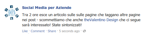 Questo post, creato sulla nostra pagina facebook che tagga la pagina di theValentino Design potrebbe apparire nelle notizie dei fan di theValentino Design. Ovvero il post di SMPA potrebbe raggiungere un gruppo di persone che non sono fan di SMPA. Niente male! Un motivo in più per interagire con la pagine. Facebook, come sempre, premia chi fa conversazione, non chi parla da solo!