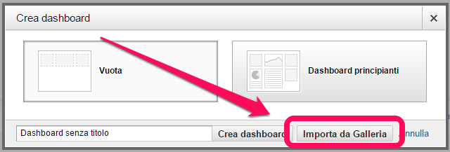 Nel caso specifico delle dashboard però abbiamo un aiuto, che viene da tutti quelli che hanno già creato una dashboard valida e, non essendone particolarmente gelosi / non temendo di essere giudicati in negativo, hanno deciso di condividerla con il mondo. Tutte queste dashboard sono disponibili e le possiamo importare con un click. Per farlo basta selezionare Nuova dashboard nel menù generale di sinistra