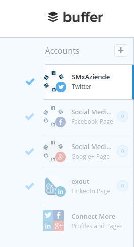 [account gratuito] Ti permette di aggiungere UN canale per ogni tipo (Twitter, Facebook, G+ e LinkedIn). E Facebook, G+ e LinkedIn ti permettono di scegliere tra profilo personale e pagina aziendale. Il free plan permette una coda di contenuti fino a 10 post (che per un’azienda/agenzia seria sono pochi).