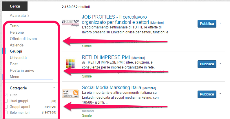 Cliccando sul pulsante a sinistra del box di ricerca si apre una tendina che permette di filtrare tra le varie categorie definite da Linkedin (persone, gruppi, aziende, offerte di lavoro, università, post, messaggi di posta).