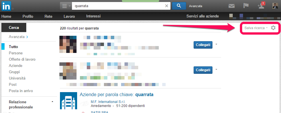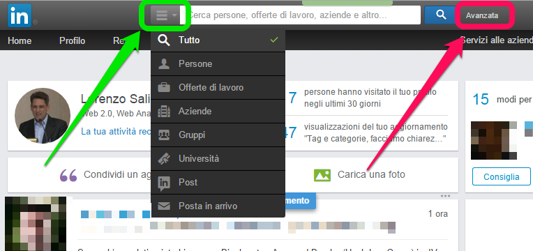 Come su praticamente qualunque sito web, anche su linkedin c’è la possibilità di effettuare una ricerca complessa a piacere. In particolare vi invito a fare attenzione un paio di cosette.