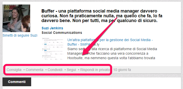 Quando viene condiviso un aggiornamento su linkedin, per il lettore c’è la possibilità di interagire in diversi modi, in particolare attraverso le opzioni in basso: Consiglia, Commenta, Condividi ecc.