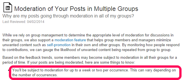 Serve a impedire il proliferare dello SPAM. I gruppi di linkedin hanno sempre funzionato grazie al fatto che lo SPAM viene mantenuto al minimo, quando non eliminato del tutto. Meno SPAM significa più disponibilità a partecipare attivamente alla vita del gruppo, senza la paura di essere inondati da messaggi indesiderati.