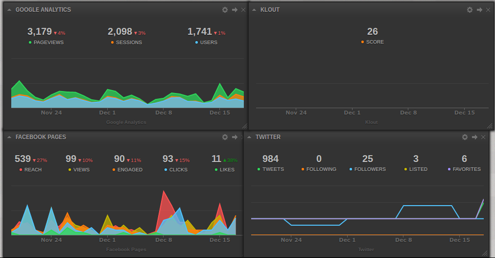 Cyfe ad esempio permette di creare dashboard personalizzate con una fotografia dell’andamento dei tuoi vari canali/apps/strumenti/piattaforme. È un ottimo strumento per capire al volo il tuo “stato di salute”.
