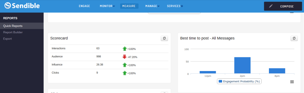 La tuo dashboard ideale comprende anche report e strumenti analitici che misurano i risultati dei tuoi sforzi sui mezzi social. L’obiettivo è trovare un PSMM che ti mostra i risultati in modo chiaro, facilmente interpretabili con dati critici. Proprio come fa Sendible.