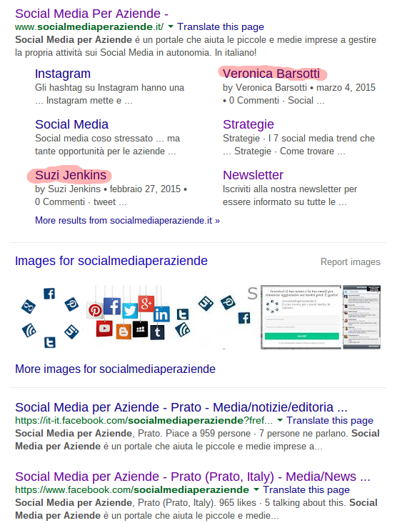 Una semplice ricerca sul nostro brand fa uscire i risultati qui sopra. Abbiamo cercato “social media per aziende”. Il primo risultato è il nostro sito, e Google è così bravo da tirare fuori anche le categorie più consultate recentemente ed anche un paio di post che sono stati di grande successo ed I NOMI DEGLI AUTORI. Ovvero le persone.
