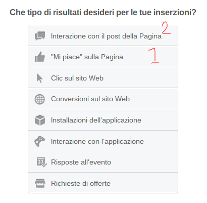 Facebook ti chiede subito i risultati che vuoi avere dalla tua azione di promozione (anche facebook lavora per obiettivi!)