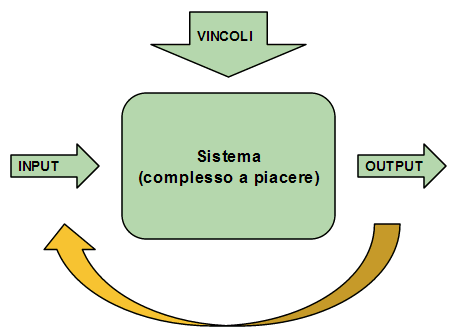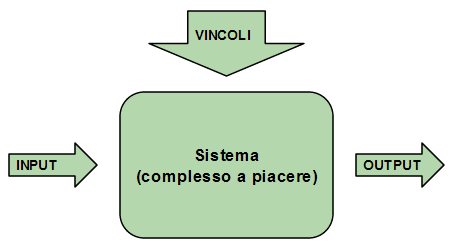 La prima considerazione viene dalla teoria dei sistemi ed è proprio riferita a come si descrive un sistema. Ci sono degli input, ci sono degli output e ci sono dei vincoli da rispettare (tecnicamente sono input pure loro, ma separarli graficamente mi aiuta a tenerli meglio sotto controllo).