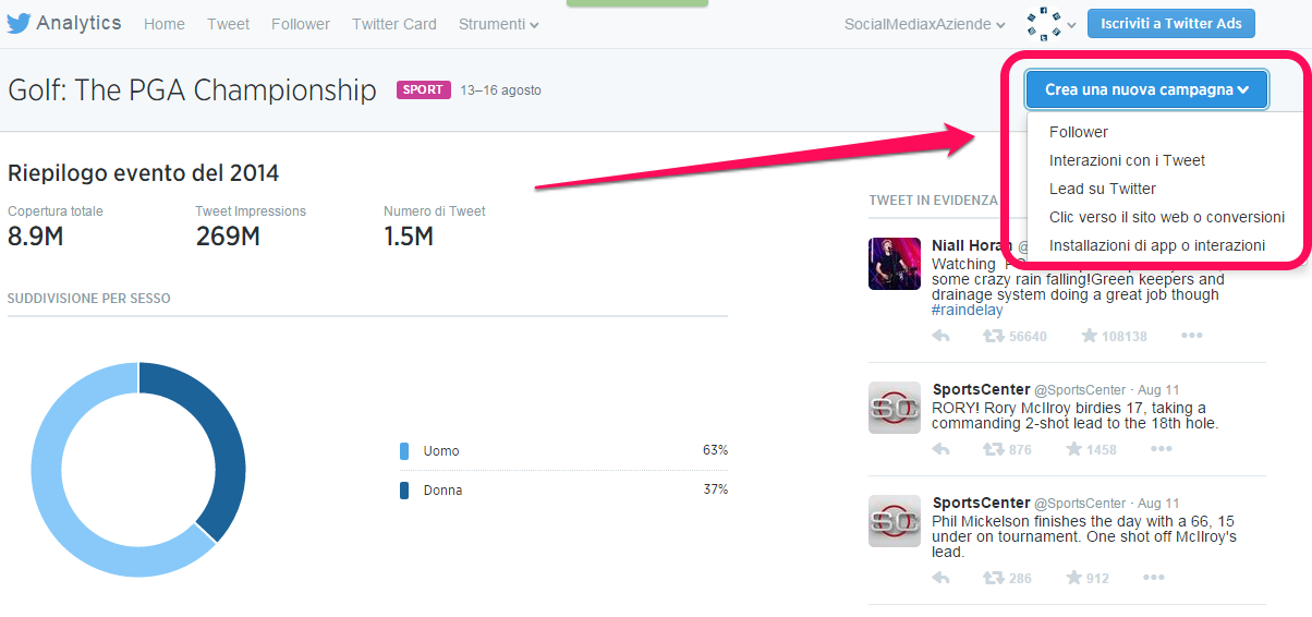 L’attivazione consiste nella creazione di una campagna che funziona come le normali campagne di Twitter (quindi è possibile aggiungere altri filtri come genere, lingua, device…), ma che è mirata specificamente a quell’evento.