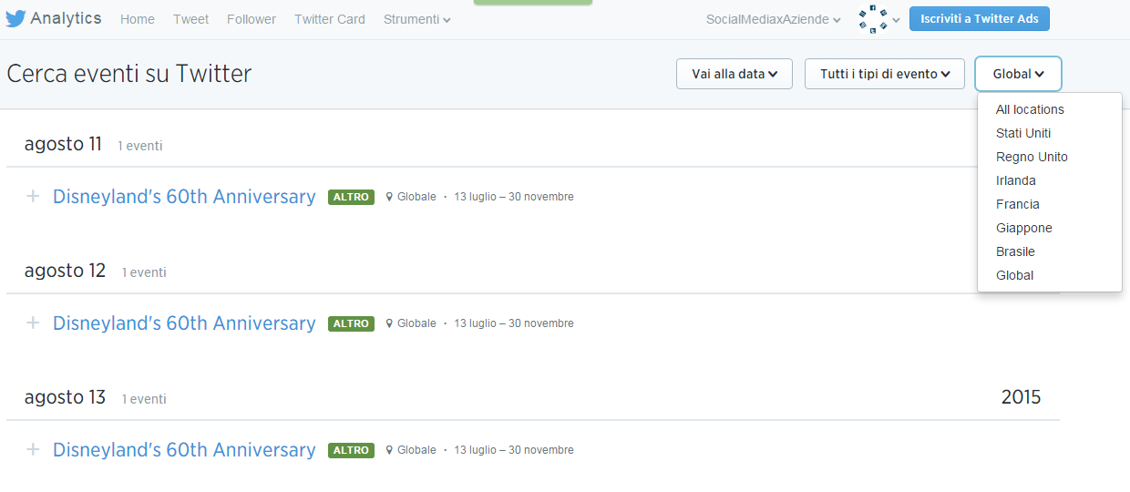 Quando si clicca su Calendario dell’evento si va ad una pagina dove sono riportati tutti gli eventi censiti da Twitter e in cui è possibile filtrare per data, tipo o luogo dell’evento.