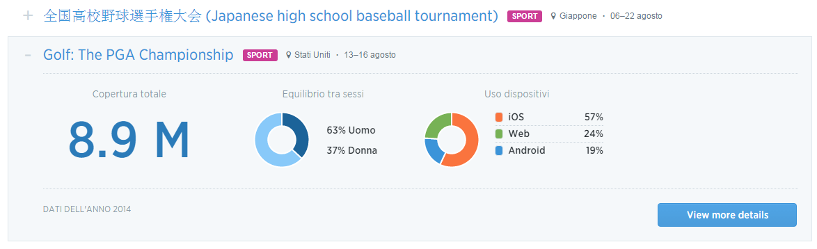 Sulle statistiche abbiamo una seconda limitazione, visto che al momento di eventi con statistiche annesse ce ne sono ben pochi. In ogni caso laddove le statistiche sono presenti, ci sono informazioni su genere, dispositivi usati, località di provenienza (nei dettagli) e pubblico raggiunto. Nei dettagli (cliccando su View more details) sono anche presenti i tweet in evidenza relativi all’evento.