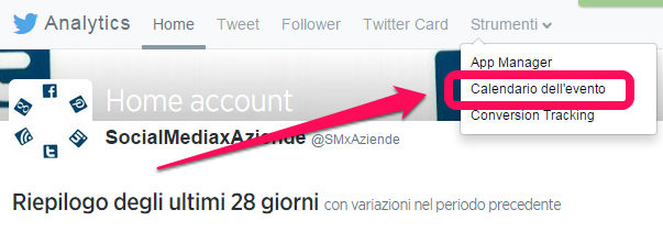 Per iniziare basta andare nella sezione Strumenti di Twitter Analytics e cliccare su Calendario dell’evento.