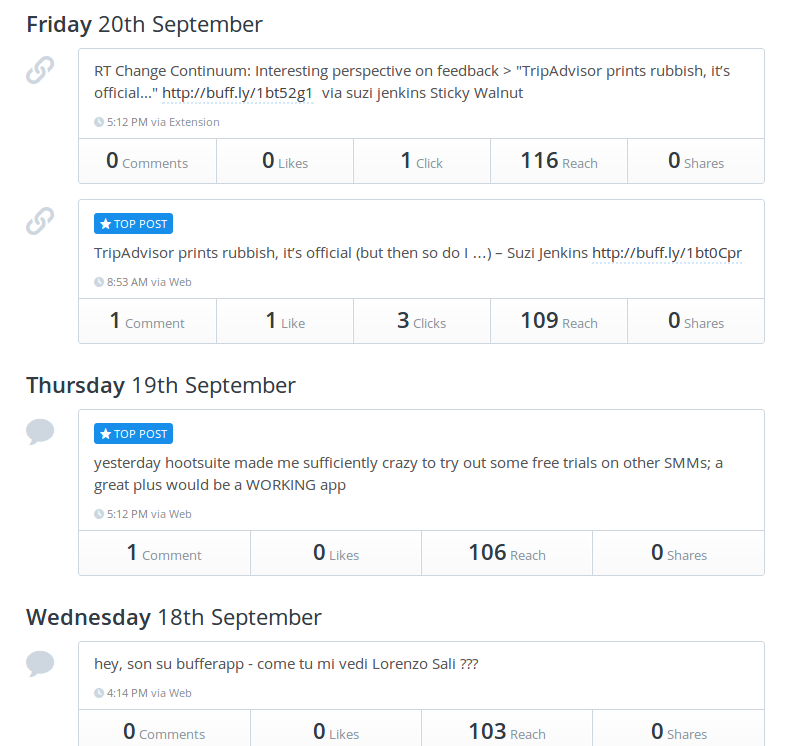 Questa non è male come funzione. Praticamente Buffer ti offre un quadro della situazione per ogni post inviato tramite Buffer – in modo molto chiaro e leggibile. Ti offre questa pagina di riassunto per ogni singolo canale che hai impostato in Buffer ma solo per i contenuti inviati con Buffer.