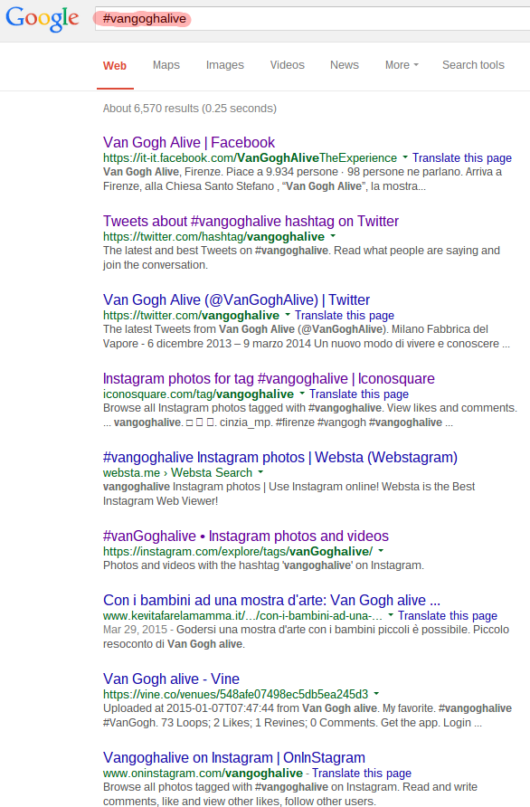 Con quest’analisi si potrebbe andare avanti anche per qualche ora. Potremmo guardare la pagina www.vangoghalive.com (a quanto pare di proprietà di un’organizzazione russa che ospiterà la mostra ad ottobre 2015) con associati gli account di Facebook ed Instagram e pure il social russo. Oppure la pagina www.vangoghalive.it apparentemente senza social (e se la raccontiamo tutta anche senza traduzione in inglese, almeno per le prime settimane della mostra). Mi fermo qui, il messaggio che volevo dare credo di averlo dato.