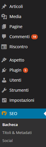 Una volta installato, nel menù a sinistra del pannello di amministrazione di WordPress sarà presente la voce SEO, cliccando sulla quale si aprirà il sottomenù dedicato al plugin.